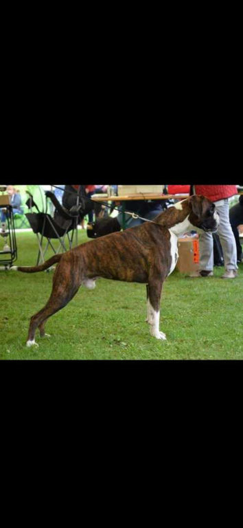 gross, goldgestromt mit weiss, harmonische Gesamterscheinung, typstarker Boxerkopf! Sehr gut gewölbter breiter Fang Stop & Stulp, prima Ausdruck. Mittelbreiter Zahnstand, sehr gut aufgebautes Gebäude, prima Halsschwung, sehr gute Ober- und Unterlinie & Brusttiefe & Vorbrust, sehr gute Winkelungen, raumgreifendes Gangwerk.