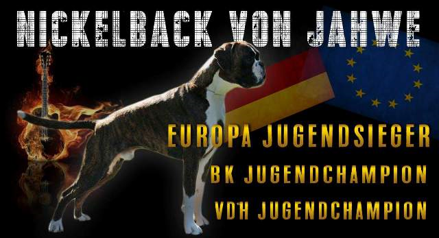 Die Jugendklasse gestromt war mit lediglich 3 Rüden besetzt, die alle die höchste Formwertnote erhielten. Unangefochten gewann hier Nickelback von Jahwe/D, ein 14 Monate alter, typvoller und lienienschöner Rüde mit mächtigem Fang und ausgewogenem Gebäude, sowie weiträumigem, schubstarkem Gangwerk bei fester Oberlinie. Er erhielt die Anwartschaften auf den Jugend-Champion (VDH) und (BK) und im Stechen gegen den Gewinner der gelben Jugendklasse auch den Titel Europajugendsieger, Herr Werner kürte ihn später gegen die beste Junghündin zum besten Junghund der Ausstellung ...